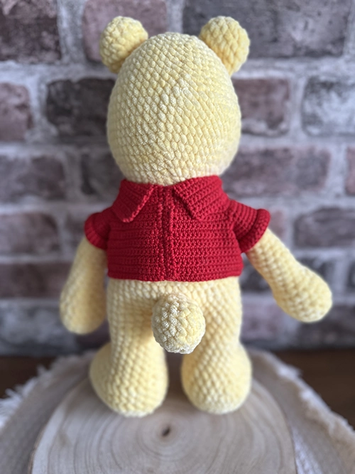 Tout d’abord, son corps est confectionné en laine chenille ultra douce, ce qui lui confère un toucher moelleux et agréable 🧶. Ensuite, il porte son iconique pull rouge en laine coton, fidèle au personnage original ❤️. De plus, il est accompagné de son adorable petit pot de miel 🍯, crocheté avec soin, qui apporte une touche supplémentaire de charme et d’authenticité.
